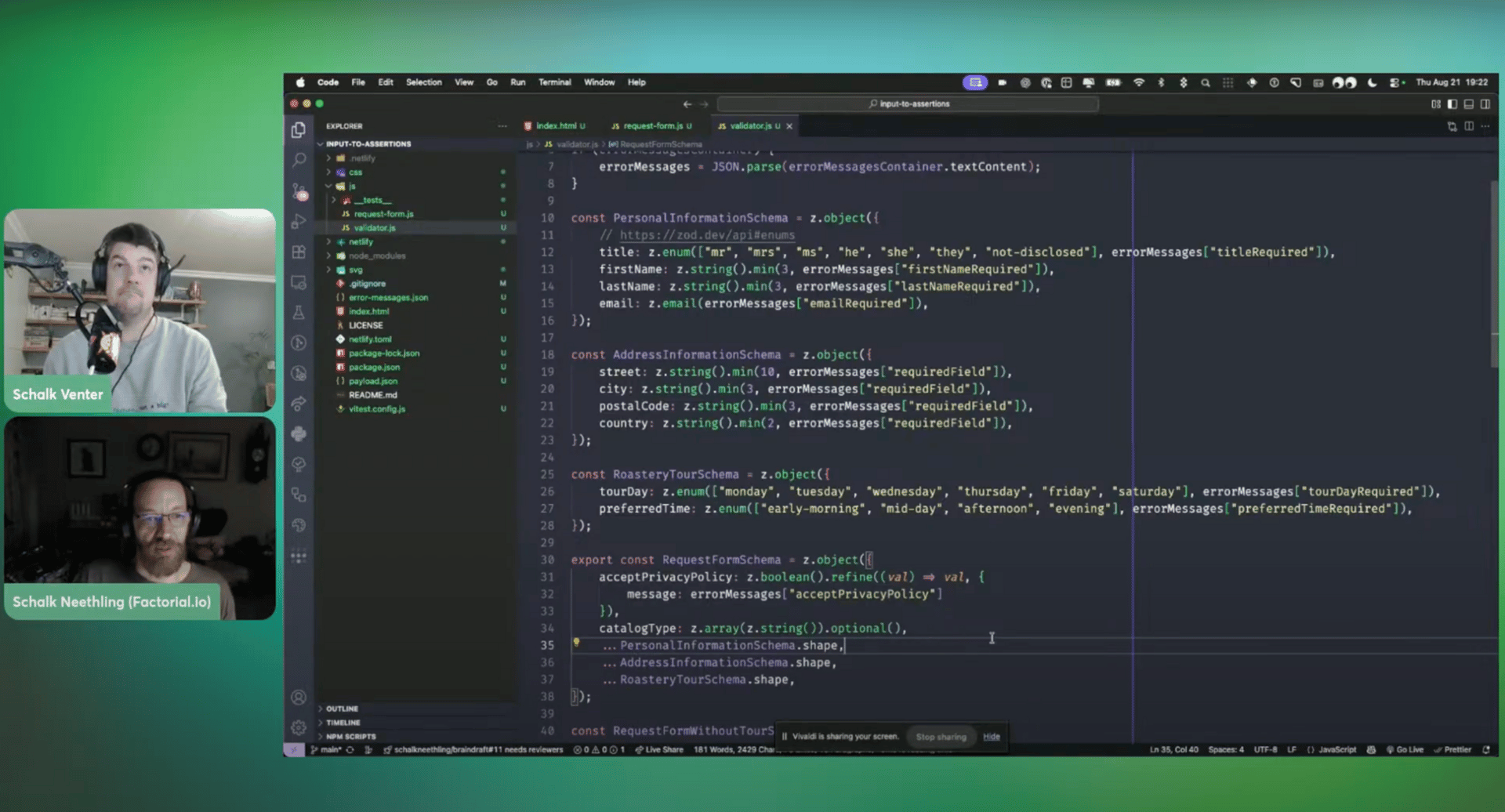 Schalk takes us through a real-world example of a dynamic form with conditional fields, optional arrays, validation rules based on user selection, and multilingual error messaging — all managed through Zod.